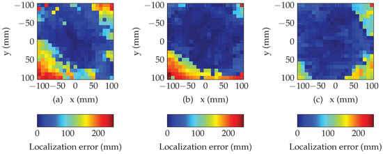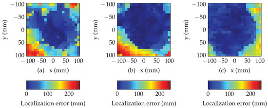 Figure 8 presents the performance of the multi-lateration algorithm using random search. The plots present the error in magnitude between the estimated position (returned by the algorithm) and the true values of the tag location (known using the positioning table, see Figure 5), for each position. Figure 8a–c plot the results corresponding to heights h of 5 cm, 10 cm and 15 cm. For all positions, initial position has been set at and . The algorithm has been run over 2000 iterations which ensures the convergence (i.e., 10 ms). We can see that multi-lateration algorithm returns an accurate estimation of the location over a large part of the overall space (areas in blue in Figure 8). If we consider a reduced an area of 10 cm centered above the antenna, localization error is lower than 1.98 cm (resp. 1.00 cm and 0.941 cm) for a distance of 5 cm (resp. 10 cm and 15 cm). Moreover, we can easily see that the area where the localization error is low, increases when the distance between the tag and the antenna increases. These results constitute the basic performances of our localization method and will be used as a reference for comparison purpose with the performances with the method presented in the next section.
