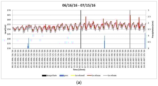 For each period, description statistical analysis was performed. Table 2 reports the level values of average, maximum, minimum, standard deviation, and median. Moreover, the trends of minimum, maximum, and median levels and the precipitation are reported in Figure 12.