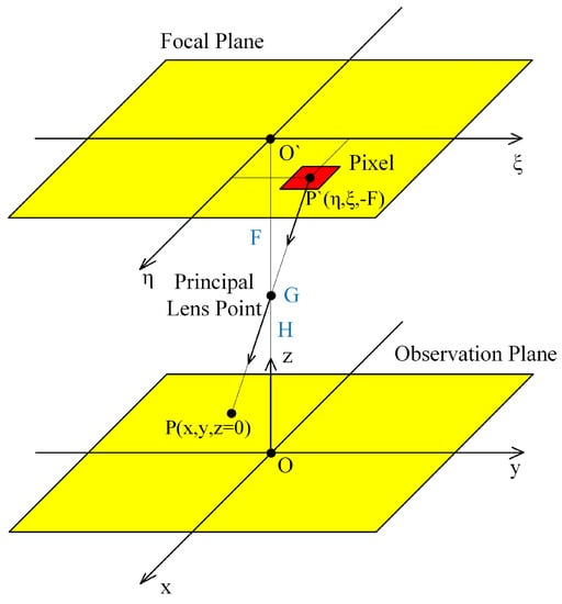 A general approach to the OF computation is based on the pinhole camera geometrical model assuming the flight over a flat surface [,,] (see Figure 1 and Figure 2).