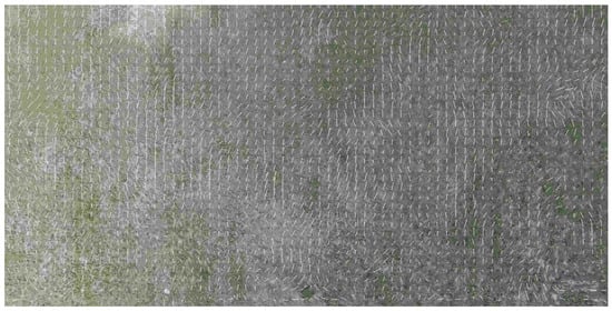 In our experiments, we used standard HERO 5 camera (GoPro Inc., San Mateo, CA, USA) and did not change its parameters during the flight. Since the aim of our research is the analysis of possible applications of video navigation in UAV, the camera is at the nose part of the light aeroplane. This aeroplane performed the series of approaches to the runway with accurate recording of the images and telemetric data. During the descent, the resolution of the camera sharpens, and it captures more and more tiny details which prevent good estimation of the image movement. Thereby, the estimation of the OF, which behaves more or less regularly at relatively high altitude, becomes absolutely chaotic when it approaches the earth surface. It is possible to observe this effect in the sequence of frames where the image motion velocities calculation done L–K estimates (see Figure 3), where the image is in almost natural scale with averaging . It is necessary to coordinate the camera resolution with the current altitude of flight to avoid this effect. Another effect is the increasing image velocity and therefore the additional blurring of the image, which needs the coordinated increasing of the frame rate. Of course, all such features usually do not present in standard cameras and their usage in navigation demands the developments of special observation tools. However, some issues may solve by onboard image processing. It means the artificial change of the resolution by averaging. The effect of the averaging is in Figure 3 and Figure 4.