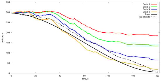 Estimated altitude in comparison with the real one obtained with a various level of resolution with averaging from to One can see that only the averaging gives the acceptable accuracy of the altitude estimation in the range from 300 m to 50 m. Scale 1, 2, 4, 8 estimated altitude obtained by optical flow and Kalman filtering with different level of averaging, namely from 1 to 8. Base is the program motion. INS is the altitude from the inertial navigation system.