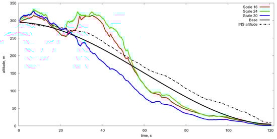 Estimated altitude in comparison with the real one obtained with a various level of resolution with averaging from to One can see that the averaging greater than gives the acceptable accuracy of the altitude estimation in the range from 50 m to 5 m. Scale 16, 24, 30 estimated altitude obtained by optical flow and Kalman filtering with different level of averaging, namely from 16 to 30. Base is the program motion. INS is the altitude from the inertial navigation system.