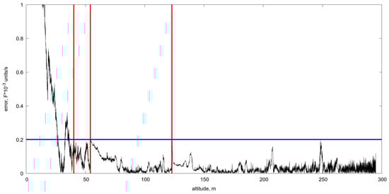 The difference (error) of the optical flow velocities via Lucas-Kanade and exact values, calculated at different altitudes from 300 m to 0 m. Vertical red lines show moments of switching of the averaging levels, that are: , , , and from right to left.