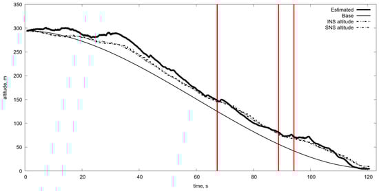 The altitude estimation via optical flow with switching averaging scale. The estimation of the altitude is made on the basis of standard Kalman filtering by fusion of data from the control system and the optical flow measurements. Of course, at low altitudes, less than 25–30 m, the OF measurements are corrupted by very high noise, but the usage of dynamical model and data from control system permit estimate reliably the altitude up to 5 m. Estimated is the altitude obtained by OF and Kalman filtering. Base is the program motion. INS is the altitude from the inertial navigation system. SNS is the altitude from the satellite navigation system.