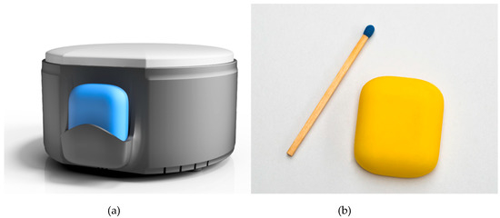 The AIDE-MOI system consists of a home station and a fall detection wearable sensor, as shown in Figure 1. The wearable sensor is the main part of the system. The sensor is small (l × b × h 25 × 30 × 8 mm, weight 7.2 g) enough to be easily wearable as stated in a recent review on medical sensors in Internet of Things [34]. As shown in Figure 2, the sensor can be attached to the body and records the acceleration (3 axis accelerometer [35], 100 Hz, +/− 8 g, 10 bit resolution) and temperature (+/− 2 °C) of the user. In case of a fall, the sensor sends an alarm to the nearest home station via a 2.4 GHz long range radio (EM9209) [36]. Due to the proprietary radio protocol (LoRaTM) and the low baud rate, data can be transmitted over several hundred meters. LoRaTM is a physical wireless protocol based on a unique modulation format (frequency modulated (FM) chirp) allowing for connections in a range of many kilometers. The electronics are covered with a biocompatible silicone coating to protect against irritation and skin reactions. The complete sealing makes the sensor waterproof, and it can be worn during showering and bathing. The sensor is equipped with 1 Gbit of memory [37], which enables it to store motion data and system information for more than two and a half weeks. The recorded data can be downloaded via Bluetooth. The sensor can easily be recharged wirelessly using the home station (Qi-Standard). The optimal resolution, sampling frequency and other sensor characteristics were analyzed and studied in a previous study [33].