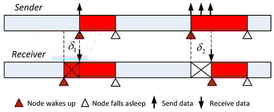 However, clock error between the sender and the receiver exists in real situations. As shown in Figure 2, because of the clock error, it would wake up earlier and keep listening. Alternatively, the sender node could prolong the sending time window (i.e., re-transmission). Both strategies will consume extra energy. Suppose that the clock error is () and receivers wake up earlier to guarantee a reliable transmission. Therefore, the duty ratio changes to: