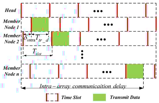 Besides data collision, communication delay is another important metric of reliable communication. Since the head will forward the data to the fusion center only when it has received all the data from its member nodes, the intra-array communication delay equals the communication delay of member node n. As shown in Figure 3, the communication delay of member node n is: