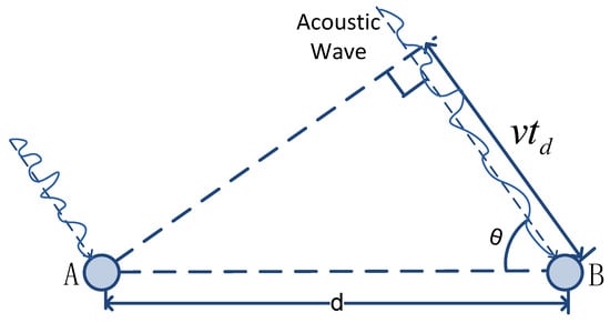 Intra-array fusion: We assume that acoustic wave arrives as a plane wave. As shown in Figure 4, node A and node B are two different nodes in the same array; the wave arrives at them at different times. The time difference of arrival is . The acoustic wave propagates at a velocity of v. The distance between the nodes is d. Then, we can get the target’s direction with respect to the array by: