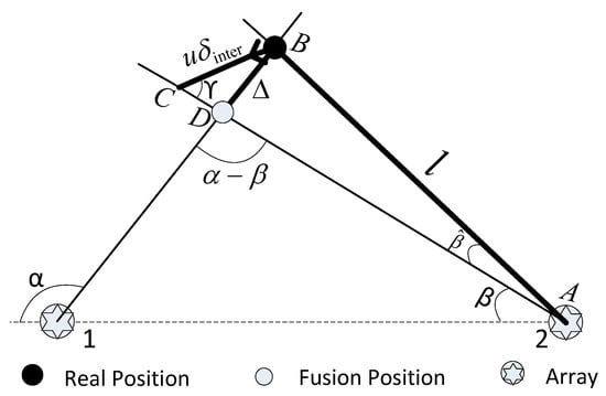 In the system, the detections from different arrays that have the same timestamp are fused to get the position of the target. Array 1, at local time , detects the target and sends the detection data (containing timestamp T) to the sink node. By intra-array fusion, we obtain the target’s direction to Array 1, which is . At the same time, array 2 also detects the target, but due to clock error () between the arrays, Array 2’s local time , so it does not report detection data at this time. Instead, when its local time is and the target has moved (u is the target’s velocity), Array 2 sends its detection data (containing timestamp T) to the sink node. The target’s direction with respect to Array 2, which is , is obtained. As we can see in Figure 5, there exists direction error ; thus, the fusion position is different from the real position.