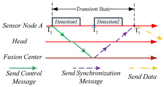 The synchronization accuracy in the sleep mode is lower than that in the detection mode. Thus, when targets appear, the system needs to be synchronized to higher accuracy; however, this takes time. As shown in Figure 6, when a target appears at , node A detects it and immediately sends a control message to the sink. Then, node A starts detecting the target. After the sink node gets the control message, it broadcasts a synchronization message immediately to synchronize the network. At , node A is synchronized. The time between and is called the transient state. In the transient state, the achieved synchronization accuracy cannot satisfy the requirements of the detection mode; thus, inaccurate localization happens. SASP takes this problem into consideration and solves it in two steps: (1) When node A receives the synchronization message at , it calculates the difference between the reference time and its local time (the reference time minus the local time), which is . (2) Estimate the real starting time of each detection in the transient state. For example, in Figure 6, the real starting times of Detection 1 and Detection 2 are and , respectively.