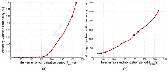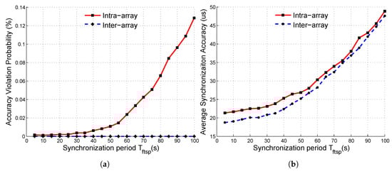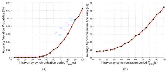 As shown in Figure 8a, when was less than 30 s, the accuracy violation probability of intra-array synchronization was zero, i.e., the intra-array accuracy constraints in (31) were completely satisfied. When was 50 s, the accuracy violation probability was about 1%, which is tolerable. However, if became larger, the intra-array accuracy constraints could not be well satisfied. Thus, by our simulation results, the intra-array synchronization period was set to 50 s in our system, and the corresponding intra-array average synchronization accuracy was 25 µs.