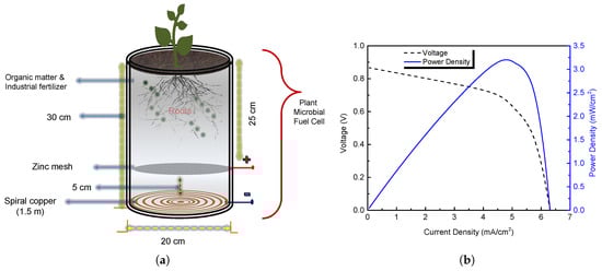 (a) Schematic representation of the proposed PMFC in the set of experiments: PMFC used with mix soil, fertilizer and the Cordyline Fruticosa plant; (b) Typical performance of a PMFC (I-V and P-V characteristic curves).