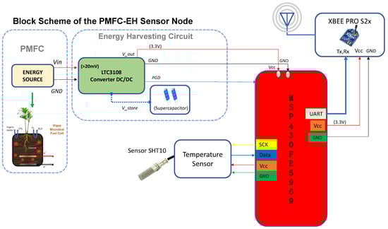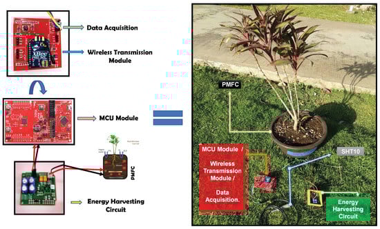 An ultra-low power sensor node architecture has been designed to perform temperature measurements in real time. The EH subsystem is adapted to the PMFC and provides the required energy to the sensor node. Figure 4 illustrates the integration of the ultra-low power sensor node design in a test field. This architecture is composed of three sections: (a) data acquisition and signal conditioning; (b) MCU; and (c) wireless transmission: