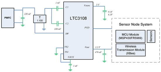 LTC3108 circuit was designed to accumulate and manage energy over long period of time. In this case, the PMFC energy is accumulated in supercapacitors and then, the PMFC-EH system is able to power the MSP430 microcontroller and components. Note that another efficient power management strategies have been implemented using the LTC3108 [,,]; however those configurations were not considered for implementing the proposed PMFC-EH system.
