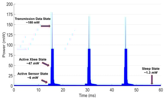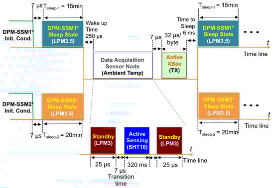 Figure 5 shows the SSM stages from data acquisition to wireless transmission. Depending on the type of DPM-SSM stage, the node can consume different levels of battery capacity; i.e., switching from Standby to Sleep mode takes 6 ms and operates with a power down current of A. Transition times between states are also considered in the DPM model, with all values taken from device datasheets.