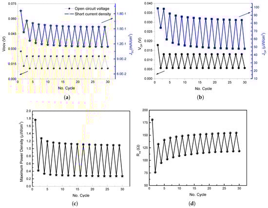 Figure 10c shows different curves. The reaches a maximum value of 3.5 mW cm, corresponding to a equal to 5 mA cm and a of 0.7 V. The figure analysis shows that the hysteresis is accentuated around the density point with variations of up to 1.5 mW cm. According to the maximum power transfer theorem, maximum power is achieved when is equal to []. Thus, is calculated per cycle using (2), with results that oscillate between 90 to 150 . Figure 10d presents the results of the maximum power density and the PMFC internal resistance.