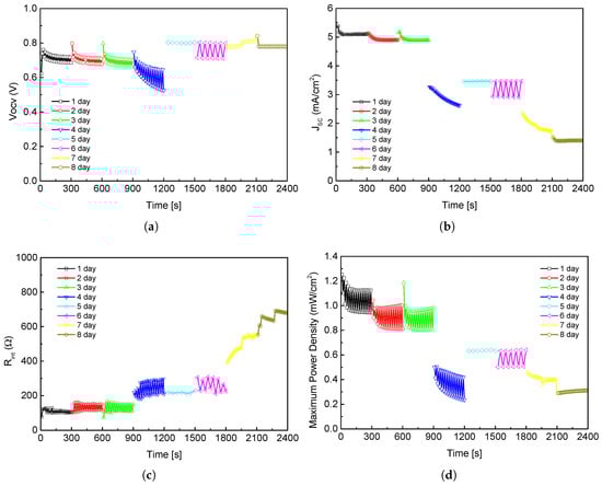 The potential required by the sensor node for processing, sensing, and communicating is balanced with the energy harvested from the PMFC. In this regard, the power energy generated by the PMFC and the stability of the PMFC electrical parameters, such as open circuit voltage , short-circuit current , maximum power , and , were analyzed (see Figure 10).