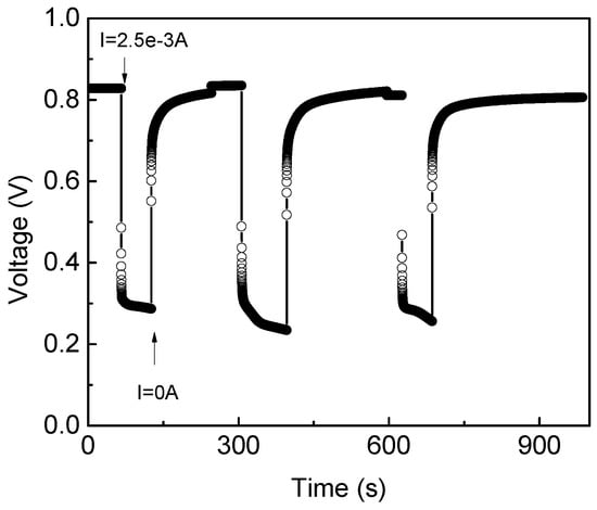The (black line) and (blue line) of the PMFC are illustrated in Figure 10b for time cycle periods of 20 min, according to the DPM-SSM strategy presented in Section 3.3. In the results, tends to decrease smoothly producing variations of up to 0.5 mA cm across the cycles. has variations of 0.7 V–0.8 V at the same number of cycles.
