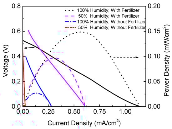 Figure 9 shows the influence of fertilizer in the PMFC. The experiment tests the PMFC behavior with and without the FERTIQUIM fertilizer. Note that the power, current and voltage in the polarization curve is improved in the experiment.