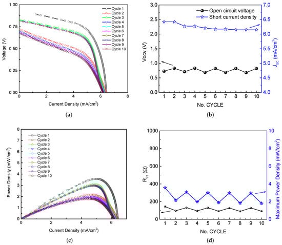 (a) Polarization curve of PMFC when the controlled potential is maintained for ten cycles; (b) Comparative analysis of the open-circuit voltage (black line) and short-circuit current (blue line) for ten cycles; (c) Power curve of PMFC; and (d) maximum power density (black curve) per cycle and internal resistance parameter (blue curve) per cycle.