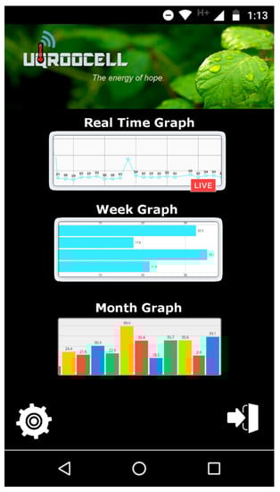 A self-powered PMFC-based energy harvester system for WSN-IoT applications has been implemented. The system is capable of performing temperature data acquisition, cloud-based data storage services, and analysis, as a proof of concept. Likewise, a web-based monitoring system has been developed for online presentation of the measured data. Figure 12 shows the main menu of the user interface on an Android mobile device. The main menu is composed of three main icons: the Real Time Graph, which opens a sub-window where the acquired temperature data are displayed in real-time over a period of time; the Week Graph, which displays the temperature mean by week via a new sub-window; and the icon Month Graph, which shows the mean temperature of the previous months in a new sub-window. The data are also stored in the cloud and are available for analysis via other statistical software applications.