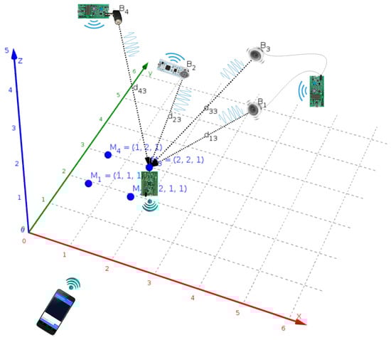 Moreover, the 3D points with depict measured locations where the receiver platform, which includes a MEMS audio sensor, performs the signal acquisition and processing. The beacons are previously calibrated, and their results are remotely communicated from an adapted WiFi interface to a smartphone that shares a WLAN network.
