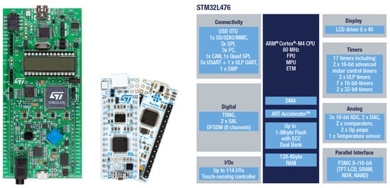 - STMicroelectronics. STM32L476VG Ultra-Low-Power with FPU ARM Cortex-M4 MCU 80 MHz with 1 Mbyte Flash, LCD, USB OTG, DFSDM. 2017. Available online: http://www.st.com/en/microcontrollers/stm32l476vg.html (accessed on 20 November 2018).