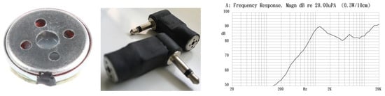 Miniature speaker KDMG10008C encapsulated with jack connectors and its frequency response.