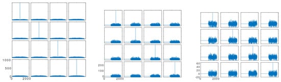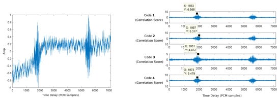 In the proposed system, sequences of bits (Figure 5 left) were used in the following way: Four codes of 255 bits have been generated from four Kasami codes of 1023 bits with better properties (Figure 5 middle) by taking the central part of the previous ones (bits from –). Similarly, four codes of 63 bits were generated by taking the bits from – (Figure 5 on the right). All families thus generated retain good cross-correlation properties, quasi-optimal orthogonal performance, and good cross-correlation values with the parent codes of the 1023-bit family.