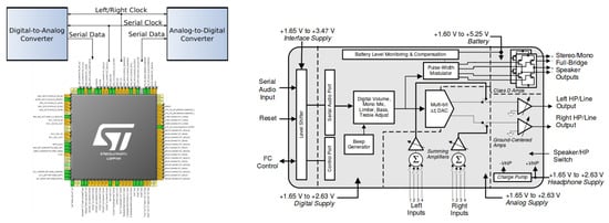 In addition, two Serial Audio Interfaces (SAI) are available on the STM32 for digital audio devices’ connection. This interface is one of the most common mechanisms for transferring data from two audio channels between devices within a system, selecting between several standard protocols such as [28], PCM-coded pulse modulation, Intel AC’97 [29], or user-defined ones. As can be seen in Figure 6, in brief, a SAI can establish a communication bus with ADC and DAC. One of the SAI interfaces of the STM32 was used in this case to communicate with the audio DAC CS43L22 [30] on the platform STM32L476 via bus in address and by means of a stereo jack connector to an omnidirectional MEMS microphone, which provides a Pulse Density Modulated (PDM) digital signal.