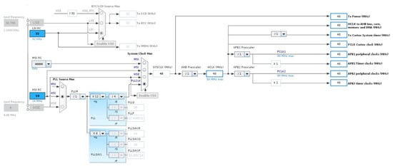 The resources used in the MCU for this phase were: a timer, a DAC, and a DMA channel between the memory and the peripherals. The pin configuration was required to use external resources such as the DAC output, as shown in Figure 6, in addition to a correct clock configuration for the use of the timer and other resources of the MCU (Figure 7).