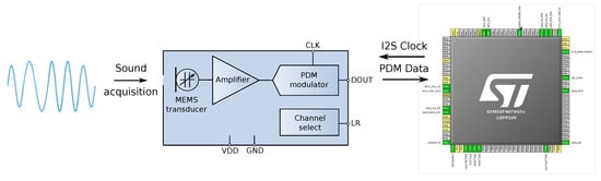 The MEMS microphone used in this system was the MP45DT02 [35]. Its main characteristics are the reduced size (HLGA package: 4.72 × 3.76 × 1.25 mm), the low power consumption, and the omnidirectional sensing. The aperture to capture sound is approximately 1 mm in diameter. If the stages most prone to noise effects are under control, well shielded, and isolated from the rest of the board system, the digital audio stream can be of higher quality (61 dB SNR, dBFS sensitivity, 120 dBSPL AOP).