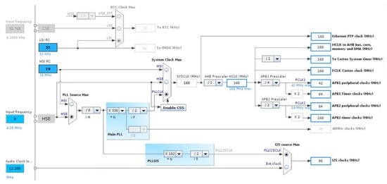 The main parts of a digital microphone are depicted in Figure 11. The Clock input (CLK) was used to control the PDM modulator. The range for the MP45DT02 mic goes from 1 MHz–3.25 MHz, and according to the desired sampling rate (48 kHz), it will be fixed to 3.072 MHz. This value has been calculated for a discrete-time representation (PDM bitstream) with an oversampling rate and a corresponding decimation factor of 64. To drive an I2S clock of such precise frequency, PLL clock resources are configured in the SoC from the 8 MHz HSE clock input to the PLL I2S clock by pre-scaling to 96 MHz and, next, by the I2S clock internal divisor to obtain the desired frequency, as shown in the bottom of Figure 12.