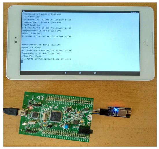 As depicted in this figure, a serial WiFi module (DT-06 Wireless WiFi) [36] was attached via an UART interface of the main board to interact remotely during the calibration process and to obtain positioning data from a smartphone in wireless mode.