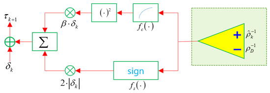 The goal is to adjust the detection threshold so that the estimated clutter measurement density for the measurements converges to the desired clutter measurement density . In other words, the input is the inverse of the clutter measurement density, and the output is the detection threshold; thus, it cannot be implemented with the existing extremum seeking control structure. In this section, we propose an extremum seeking control structure considering the nonlinearity between the input and output values. Considering the exponential signal amplitude probability distribution of clutter, as shown in (16), the transfer function is characterized by a non-increasing function. This means that there is no local extreme value and that it has only one extremum after applying the square function. In this case, extremum seeking control guarantees convergence to the global extremum [10,13]. The block diagram is shown in Figure 1. The extremum seeking control structure in this subsection is divided into two parts considering the detection process. The upper part serves to find the extremum, and the lower part plays the role of determining the sign.