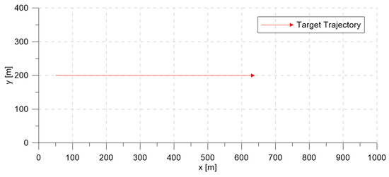 The target started from position mm with a constant velocity 12 m/s, and the target trajectory is depicted in Figure 3. The standard deviations of the range and bearing measurements were m and , which are similar to the ones used in target tracking of [26], respectively. The active sonar at mm measured the target information with sampling interval s, and the was eight. The desired clutter measurement density obtained through the algorithm in Section 4 was m.