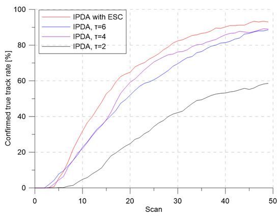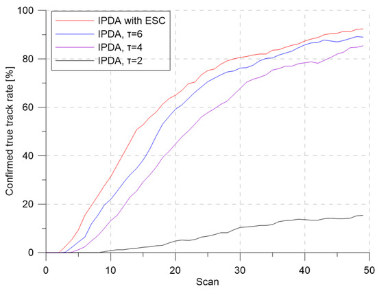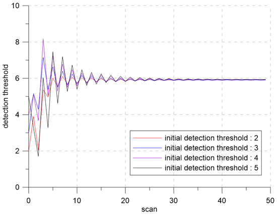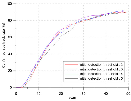 To analyze the effect of the initial detection thresholds on the tracking performance, the simulation with varying the initial detection thresholds was performed. The initial detection thresholds were selected as = 2, 3, 4, and 5.