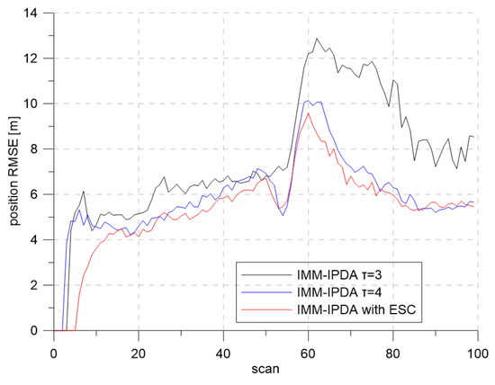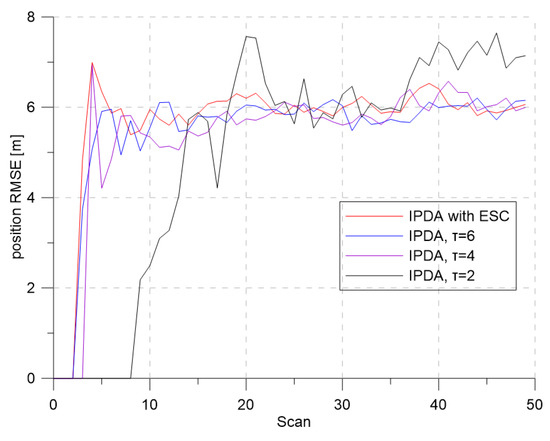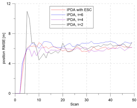 Figure 5 and Figure 6 show the CTTR and position RMSE for Monte Carlo simulations, respectively. In the figure, the red line is the tracking result of the IPDA with the proposed detection threshold control with extremum seeking control, and the blue, purple, and black lines are the results when the detection threshold was fixed at 6, 4, and 2, respectively. In all four cases, the CTTRs did not reach 100 percent, but the CTTR result for IPDA with the extremum seeking control was seen to be the best. When the detection threshold was two, the clutter measurement density was , and the detection probability of the target was . Although the clutter measurement density did not differ much from the desired clutter measurement density, the target tracking performance was somewhat different. This means that a small change in the clutter measurement density can have a significant impact on the target tracking performance. When the detection threshold was six, the clutter measurement density was , and the detection probability of the target was . The clutter measurement density was much smaller than the desired clutter measurement density. Although the number of generated clutters was small due to the small clutter measurement density, the detection probability of the target also decreased proportionally; thus, the target tracking performance decreased because the frequency of track updating (which uses the target measurement) was low.