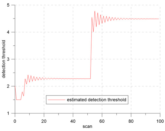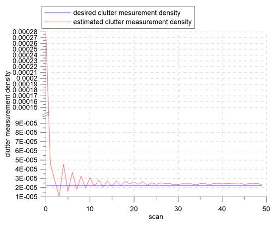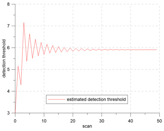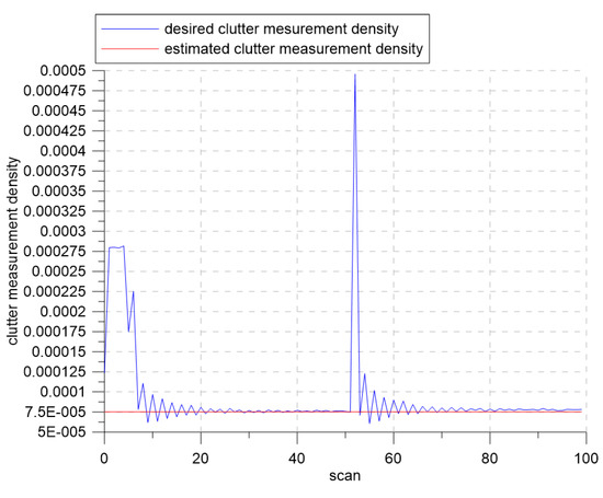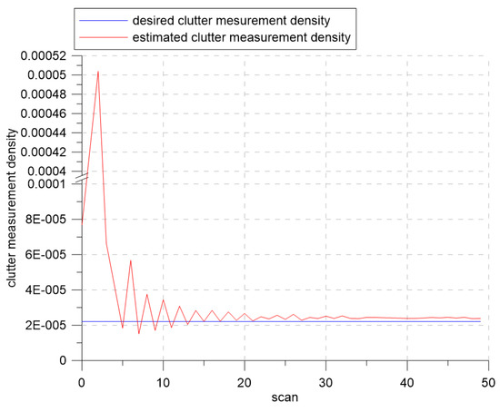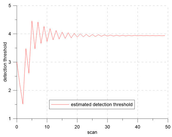Figure 7 and Figure 8 show the changes of the estimated clutter measurement density and the detection threshold, respectively, when using extremum seeking control. In Figure 7, the red and blue lines indicate the estimated clutter measurement density and the desired clutter measurement density, respectively. At the beginning of the simulation, the estimated clutter measurement density was much different from the desired clutter measurement density, but converged to the desired clutter measurement density value after Scan 25. In Figure 8, the detection threshold starts from the initial value of three and converges to the value of . Thus, this value is a detection threshold for which the estimated clutter measurement density converges to the desired clutter measurement density.