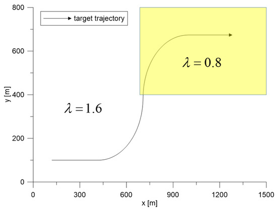 In the first scenario, two constants were designated to model different pdfs of the clutter signal strengths to test the robustness under different environmental conditions. The IPDA algorithm was used for tracking the non-maneuvering target. Based on the analysis of the simulation results, a more complex scenario of maneuvering target tracking in a heterogeneous clutter environment was devised. In this scenario, the clutter distribution varied at different subareas in the surveillance region. Specifically, the surveillance region was divided into two subareas where each subarea had a different , and the target movement included crossing the border of the subareas. The target performed the maneuver twice with unknown turn rates. Therefore, the IMM-IPDA algorithm was used for better tracking performance in this scenario.