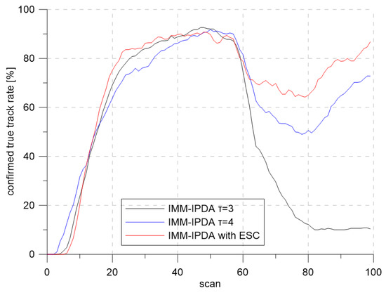 In this simulation, and were set to 40 and 20, respectively. We used the CTTR (confirmed true track rate) and position RMSE (root mean squared error) as the performance index of the tracking filter. The CTTR represents the ratio of CTT per scan to Monte Carlo simulation. The definition for CTTR is , where M and are defined as the total number of Monte Carlo simulations and the number of CTTs during a Monte Carlo simulation, respectively. The position RMSE is the calculated distance RMSE of the actual target and estimate for CTT. The formula for RMSE is expressed as: