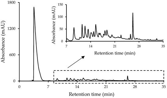 In the present work, a simple solid–liquid extraction procedure by stirring and sonication, followed by a defatting step with hexane, was proposed for the extraction of non-targeted phytochemicals from nut samples. An optimization of the extracting solvent composition was performed to maximize the total amount of extracted compounds. Thus, seventeen sample extraction conditions were evaluated for three nut samples (almond, hazelnut, and walnut), as they were extracted with different solvent mixtures including pure water, ethanol, methanol, acetonitrile, and acetone, as well as with organic solvent:water mixtures in 50:50, 70:30, and 80:20 (v/v) ratios. Considering the high polyphenolic content of nuts, a reversed-phase HPLC-UV method, previously developed for the determination of polyphenols in wine samples [25], was employed with some modifications by using a porous-shell C18 column and a gradient elution with 0.1% formic acid aqueous solution and methanol as mobile phase components (conditions described in Section 2.2). As an example, Figure 1 shows the non-targeted HPLC-UV chromatographic fingerprint obtained for a walnut sample extracted with acetone:water 70:30 (v/v).