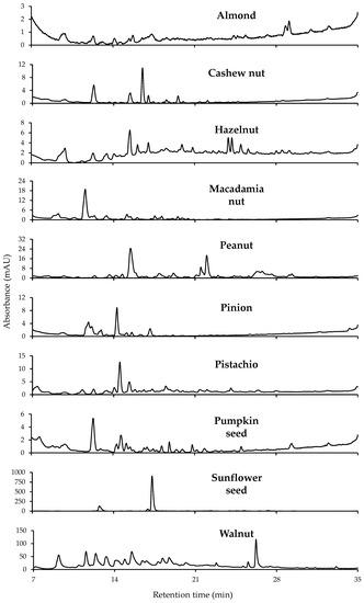Non-targeted HPLC-UV chromatographic fingerprint acquired at 280 nm for a selected sample within each nut sample type. Chromatograms displayed only from minute 7 to 35 to remove absorption of the extracting solvent and column pre-conditioning step.