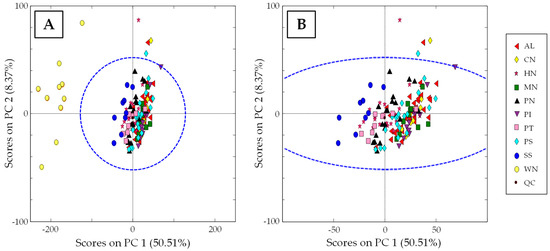 As QCs are injections of the same extract, they not only allow the detection of any possible instrumental or chromatographic issue but also to correct them. In this case, the fingerprints obtained for each sample were normalized by dividing their absorbance signal variables by those of the closest QC in the sequence, whereas each QC was divided by itself. After performing this correction, QC samples appear in the same position in the PCA scores plot (see Figure 4A), and chemometric results can be discussed. As can be seen, walnut samples are clearly separated at the left part of the plot from the other nut samples (displaying negative PC1 score values). This difference could be related to the fact that they are among the matrices with higher polyphenolic content, as previously mentioned.