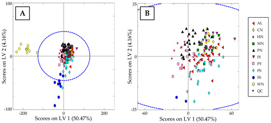 HPLC-UV chromatographic fingerprints were also used as chemical descriptors to address nut classification by using a supervised PLS-DA method, obtaining the plot of scores of LV1 vs. LV2 depicted in Figure 5A. Similar to the reported results by PCA, the observed discrimination between samples could be associated to the total amount of extracted compounds, even though in this case both LV1 and LV2 are contributing to it. In fact, PLS-DA maximized the classification of the two nuts with the highest polyphenolic content (walnuts and sunflower seeds), whereas the other samples are more concentrated in the center of the graph. To focus on this distribution, in Figure 5B, walnut and sunflower seed samples are excluded. Again, some samples, such as hazelnuts, pistachios, and peanuts, in which a higher number of extracted phytochemicals is expected according to the literature, can be distinguished from the other samples mainly due to LV1.