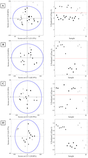 On the left, PLS-DA score plot projected in LV1 vs. LV2 and on the right, Sample vs. Y predicted 1 for (A) natural ◆ vs. thermally treated (fried or toasted) almonds ▮, (B) natural ◆ vs. toasted hazelnuts ▮, (C) fried ◆ vs. toasted peanuts ▮, and (D) toasted ▮ vs. natural pumpkin seeds ◆. Filled and empty symbols correspond to calibration and validation sets, respectively.