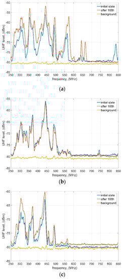 UHF spectrum of the signals emitted by SD at the initial state and after 168 h of continuous PD generation: (a) PBP; (b) PTFE; (c) GLS.