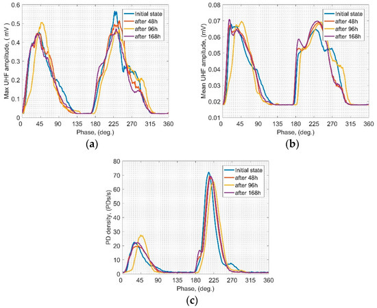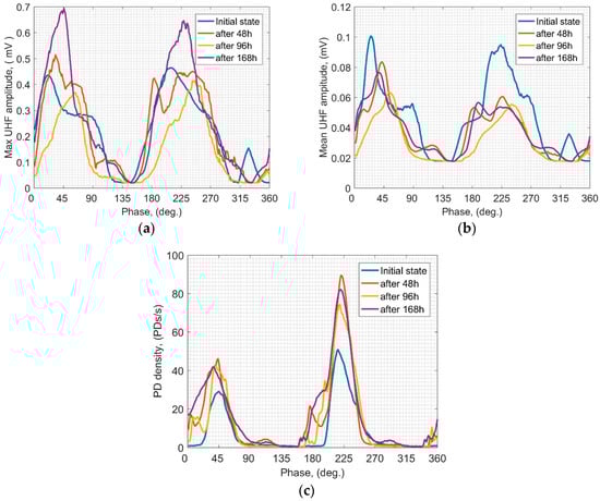In this subsection PRPD patterns achieved for all of the applied PDS in relevant time steps are presented and discussed. All of the PRPD were assigned on the grounds of the UHF signals captured for the frequency of 450 MHz (with an integration window width of 1.5 MHz), which was identified as providing the highest signal to noise ratio regarding all PDS. As mentioned in Section 3 an additional measuring track was used for the proper UHF signals synchronization with the phase of the supply voltage. Results of the PRPD for PBP are shown in Figure 3. The zones of highest activity in the phase domain are associated with relatively constant angles: approximately 30–70° and 210–250°, while max values appear around 45° and 225° in case of all analyzed parameters. Regarding the max UHF amplitudes it may be noticed that after first 48 h all of the registered values decrease, and only at the last point (after 168 h) they raised again. In addition, the behaviors in 1st and 2nd half-cycles are similar. In case of the mean amplitude, a rather constant decreasing trend may be noticed in both half-cycles—only according to the 1st half-cycle a slight rise at the last registration point may be observed. After 48 h mean amplitudes in 1st half are significantly higher than those in 2nd, which was not observed in case of max amplitudes. Analyzing the PD density, the only explicit observation is that most of the PD events are related to the 2nd half, where the highest variability is also noticed. It is because the PD generation had been initiated by negative streamer (or anode-directed) mechanism which may be commonly observed in liquids. Negative charges create “memory charge” that affects the subsequent discharge via the field distortion effect. As a result, negative streamers appear much easier (higher number of negative charges) and require lower energy than positive ones to be injected [24,26]. Furthermore, it should be emphasized that based on the PRPD analysis one can point to the rather random behavior of PD density—no explicit trend is identified. These results partially confirm discussion presented in the previous subsection—PBP is quite prone to erosion caused by SD which may be also observed in the variability of the emitted signals in the phase domain.