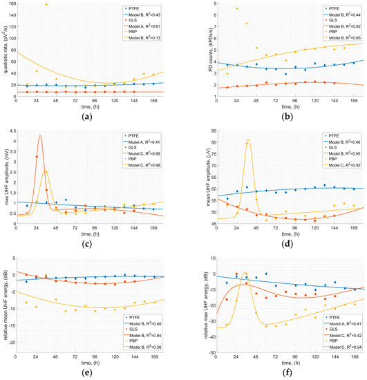 Variability of the quadratic rate is provided in Figure 6a. Almost constant characteristics may be observed regarding the GLS and PTFE scenario, while an obvious local peak (not included in the model) is noticed in case of the PBP: a rapid gain and drop are noticed within the first 48 h, whereupon a stabilized, a slight rising trend may be seen. Similar behaviors are observed in all of the analyzed descriptors regarding the PBP scenario. In case of the PD counts analysis (Figure 6b) neither PTFE nor GLS shows any significant variability—GLS showed a very slight rising trend until the last two measuring points where it starts to fall; PTFE is characterized by a constant decreasing trend within the first 84 h, and then symmetrical rising slope is noticed (after 168 h PD count is the same as at the beginning of the test). In PBP scenario a visible raising trend is presented after 48 h (after a “peak” region). The most interesting results are presented in Figure 6c, where the max UHF amplitude is investigated. Two of the analyzed scenarios show an evident local peak within the first 48 h—not only the PBP but also GLS. As for PTFE, a slight downward trend is discovered. Long-term characteristics of the mean UHF amplitudes are presented in Figure 6d. Apart from the local peak in the PBP scenario, there is also an explicit downward trend visible in GLS scenario as well as a slight upward trend in PTFE scenario.