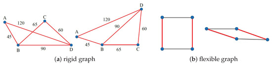 A connected graph is rigid in , if has a finite number of equivalent frameworks in , where is the d-dimensional Euclidian space [17]. The graph shown in Figure 1a is a rigid graph in (two-dimensional plane), as it has finite number of frameworks (two possible frameworks in total) in a plane. In contrast, Figure 1b shows a graph, as it has an infinite number of frameworks.